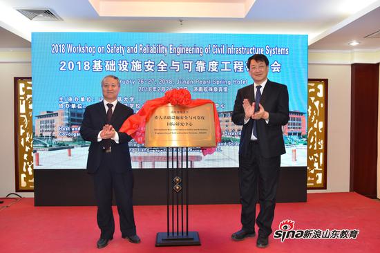 開(kāi)幕式最后舉行了山東建筑大學(xué)重大基礎(chǔ)設(shè)施安全與可靠度國(guó)際研究中心揭牌儀式。張祝秀、陳國(guó)前共同為中心揭牌。