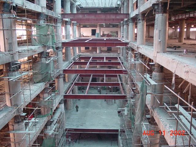 為增加營業(yè)面積,濟(jì)南銀座商城八一店采用鋼結(jié)構(gòu)將挑空部分增加五層,圓柱節(jié)點采用化學(xué)植筋結(jié)合粘鋼焊接鋼牛腿方法進(jìn)行加固處理,部分大梁采用包角鋼方法進(jìn)行加固處理,取得了滿意的效果。
