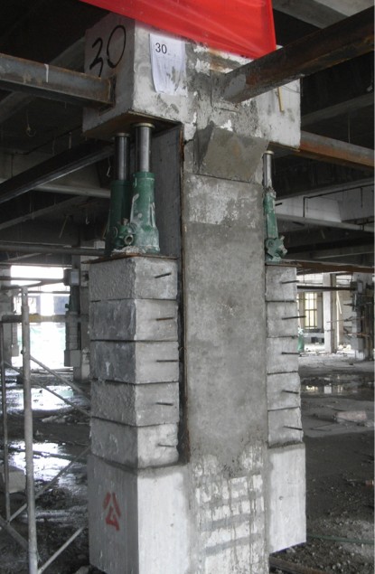 濟(jì)寧銀座商場(chǎng)(原華聯(lián)商廈)二期,為四層(局部六層)框架結(jié)構(gòu),建于1992年。原設(shè)計(jì)該建筑物的四層和五層層高為2.9m,現(xiàn)已不能滿足使用要求,每層需整體抬升1.1m。