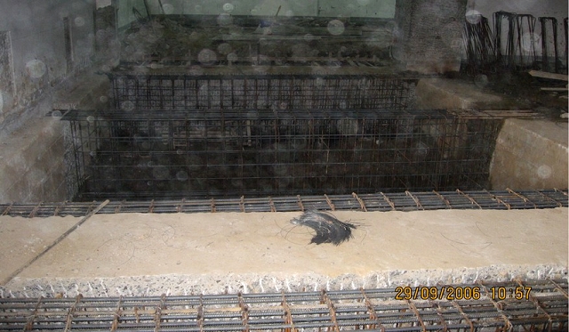 根據(jù)地基承載力驗算,新基礎(chǔ)采用筏板基礎(chǔ)即可滿足要求,但其沉降量較大。為控制新舊基礎(chǔ)的沉降差,新基礎(chǔ)采用了筏板加防沉樁的基礎(chǔ)形式,在主樓部分的下軌道梁即縱向基礎(chǔ)梁下部增加了防沉樁,以減小新基礎(chǔ)的沉降量。