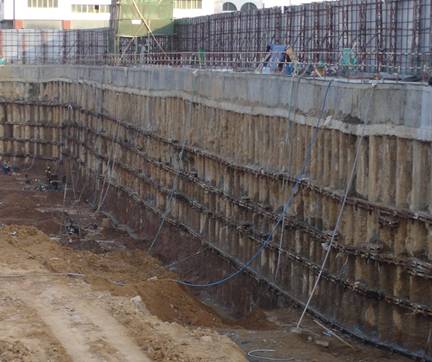 通過對各道工序的嚴格控制,基坑經(jīng)過1個多月的順利完工?;娱_挖過程中對每層的錨索施工過程按照規(guī)范和設(shè)計要求進行拉拔試驗,拉拔試驗結(jié)果表明每道錨索的承載力實際值與設(shè)計值比較接近,說明設(shè)計參數(shù)的取值比較合理。基坑開挖完畢后,基坑范圍內(nèi)所有觀測點,最大側(cè)向變形為13.3mm,大部分側(cè)向變形觀測點小于10mm,基坑周圍道路最大沉降為3mm,未見任何異?,F(xiàn)象,整個基坑所有觀測點的變形值趨于穩(wěn)定