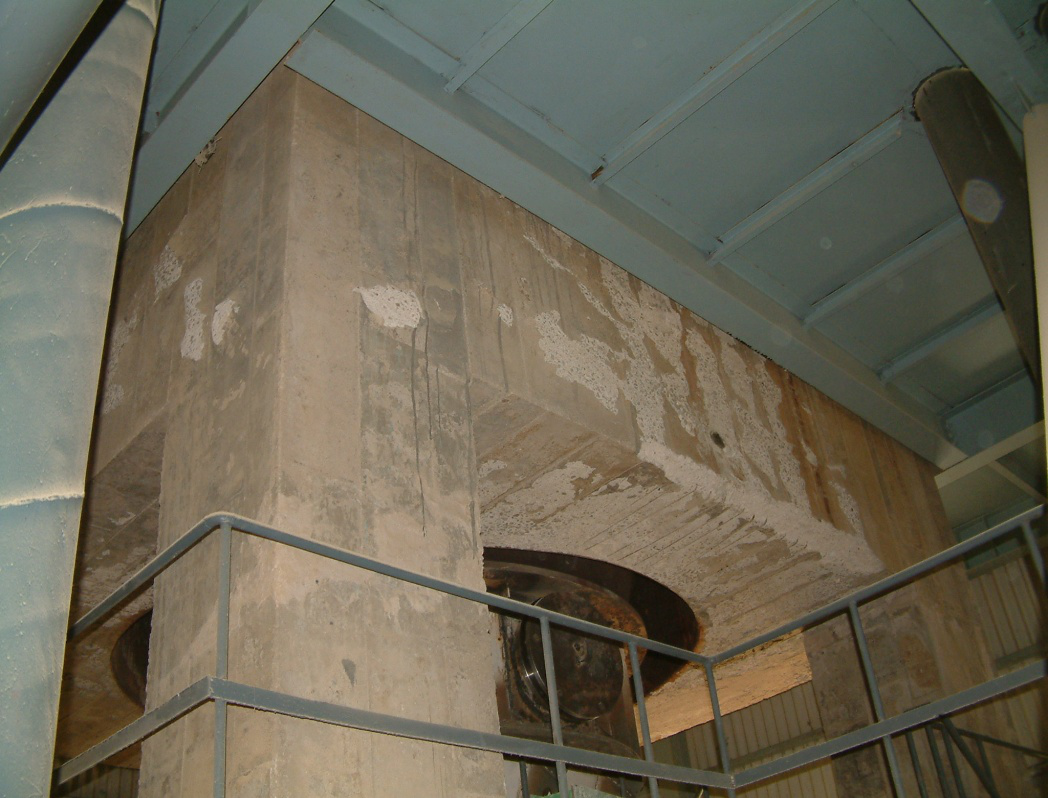 窯未投入使用即發(fā)現(xiàn)框架頂部耐熱混凝土出現(xiàn)劣化現(xiàn)象,混凝土強(qiáng)度偏低。投產(chǎn)后混凝土劣化逐漸加重(圖2~4)。遂委托我院對(duì)其進(jìn)行檢測(cè)鑒定。