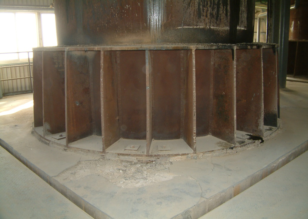 某礦業(yè)公司重?zé)G基礎(chǔ)采用鋼筋混凝土框架結(jié)構(gòu),框架底部為筏板,底標(biāo)高為-3.50m,其上置方形鋼筋混凝土柱。頂部為一厚1.40m由耐熱混凝土澆筑的平臺(tái),平臺(tái)頂面標(biāo)高為12.00m,中央為一半徑為1.73m的圓孔,重近400t豎窯即通過(guò)加肋環(huán)形鋼托盤(pán)支撐于平臺(tái)圓孔周邊混凝土頂面(圖1)。