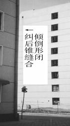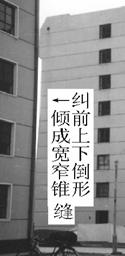 采用掏土灌水法設(shè)計施工的該項工程,糾傾工作共進行了2個月。各觀測點傾斜值全部已回至規(guī)范要求范圍,內(nèi)外縱墻原有裂縫大部分已閉合。從糾傾前照片可以看出,傾斜樓房山墻與鄰近參照建筑物墻體間在垂直方向上形成了上寬下窄的倒錐形縫,糾傾后建筑物與參照建筑物間的倒錐形縫已閉合(圖2)。