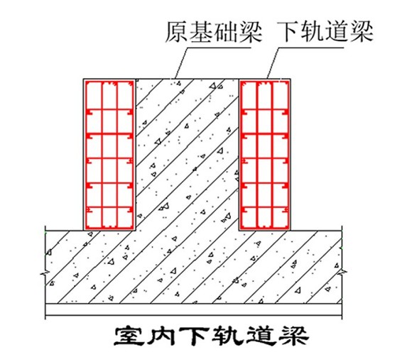 該建筑物的原基礎是筏板基礎,平移時利用原有的基礎,將縱向基礎梁兩側加寬,既是對原基礎進行加固,又可控制新舊基礎的沉降差。