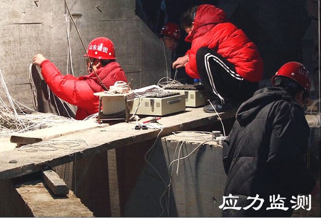 在平移施工前及平移施工過程中,隨時監(jiān)測托換梁的應力及整個建筑物的沉降、傾斜、振動情況等。