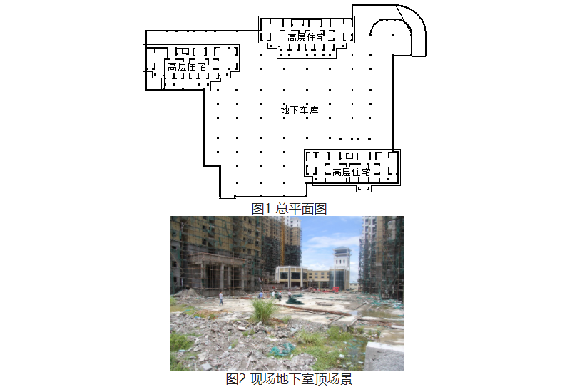海南某住宅小區(qū),由3棟高層住宅及住宅中間的單層地下車庫組成(圖1、圖2)。三座高層住宅為剪力墻結(jié)構(gòu),筏板基礎(chǔ);地下車庫為框架結(jié)構(gòu),柱下獨立基礎(chǔ)結(jié)合防水底板,防水底板為梁板式結(jié)構(gòu),防水底板與高層筏板間設(shè)后澆帶。