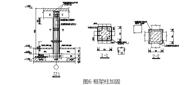 現(xiàn)場檢測發(fā)現(xiàn),車庫上浮導致柱開裂且絕大部分柱產(chǎn)生了受壓區(qū)混凝土壓碎現(xiàn)象,柱發(fā)生受壓破壞,故采用加大截面方法對車庫內(nèi)55棵框架柱進行加固。原柱每邊外擴10cm,增設(shè)豎向鋼筋及箍筋,采用高強免振搗灌漿料澆筑,見圖6。