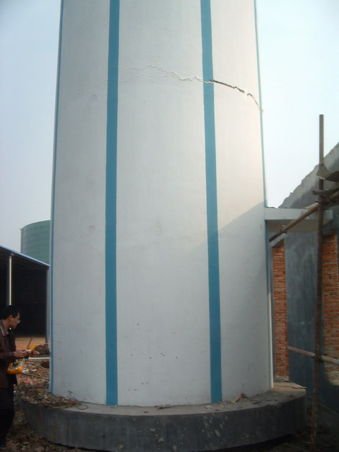 山東金明玻璃纖維有限公司水塔,為鋼筋混凝土倒錐殼水塔,設(shè)計(jì)采用04S801-2《鋼筋混凝土倒錐殼保溫水塔》中200m3 ,20m高標(biāo)準(zhǔn)圖,實(shí)際施工時(shí)根據(jù)實(shí)際情況高度變?yōu)?5m。支筒采用鋼筋混凝土支筒,半徑(外徑)為1600mm,筒壁厚度為180mm,混凝土采用C30。支筒結(jié)構(gòu)于2007年完工。由于該支筒局部出現(xiàn)裂縫(圖4~6)。