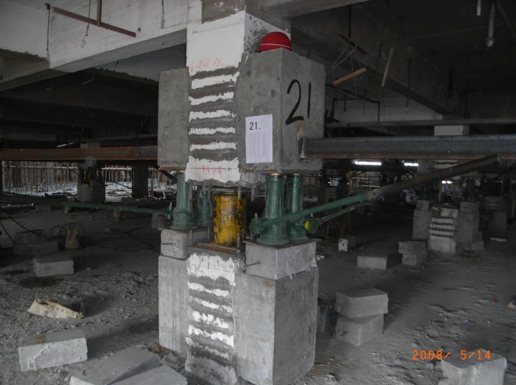 濟寧銀座購物廣場(原濟寧華聯(lián)商廈)二期工程,為五層(局部六層)框架結(jié)構(gòu),建于1992年。該建筑物的四層和五層原設(shè)計為倉庫用房,層高為2.9m,面積共計約2500㎡,現(xiàn)業(yè)主單位決定將四層和五層改造成商場經(jīng)營空間,層高不滿足使用要求,委托我公司對四層、五層進行加高改造處理。本著建設(shè)節(jié)約型社會、打造精品工程的宗旨,我公司與業(yè)主方研究決定采用整體頂升技術(shù)對四層、五層進行抬升改造,每層抬高1.25m。該工程于2008年4月5日開工,2008年6月15日完工。