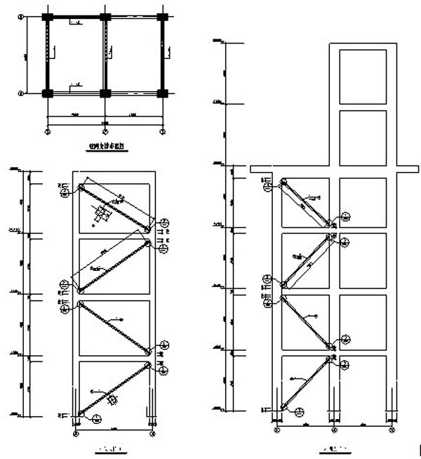 魯西化工廠銅洗框架,4層(局部6層)框架,頂部擱置一液體儲(chǔ)箱。使用過程中在風(fēng)的作用下液面晃動(dòng),使結(jié)構(gòu)出現(xiàn)較大幅度振動(dòng),頂層有明顯振感。采取增加耗能鋼支撐的方法增強(qiáng)結(jié)構(gòu)剛度,減輕振動(dòng)效應(yīng)。